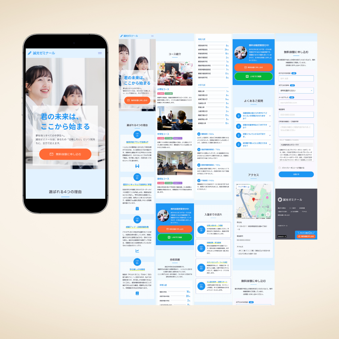 受験を前に不安を抱える中学生とその保護者に寄り添いながら、「ここに任せれば大丈夫」という信頼感を訴求。ファーストビューでは「君の未来は、ここから始まる。」という夢と希望を感じさせるコピーを起点に、前向きな気持ちとともにページへ引き込む構成としました。その後、合格率94%・累計合格者3,800名以上といった具体的な実績数値を視覚的にインパクトのある形で提示し、塾としての信頼性を裏付けます。さらに、個別カリキュラム・24時間質問対応・過去問対策など、受験生が求める具体的な特徴を順に提示することで安心感を積み上げる設計としました。最終的に料金プランと無料体験申込みフォームを明確に配置することで、自然な流れでコンバージョンへとつなげています。本サイトのデザイン・構成・コピーライティングは全て制作者が立案しており、実務レベルのWEBサイト設計を示すものとして掲載しております。