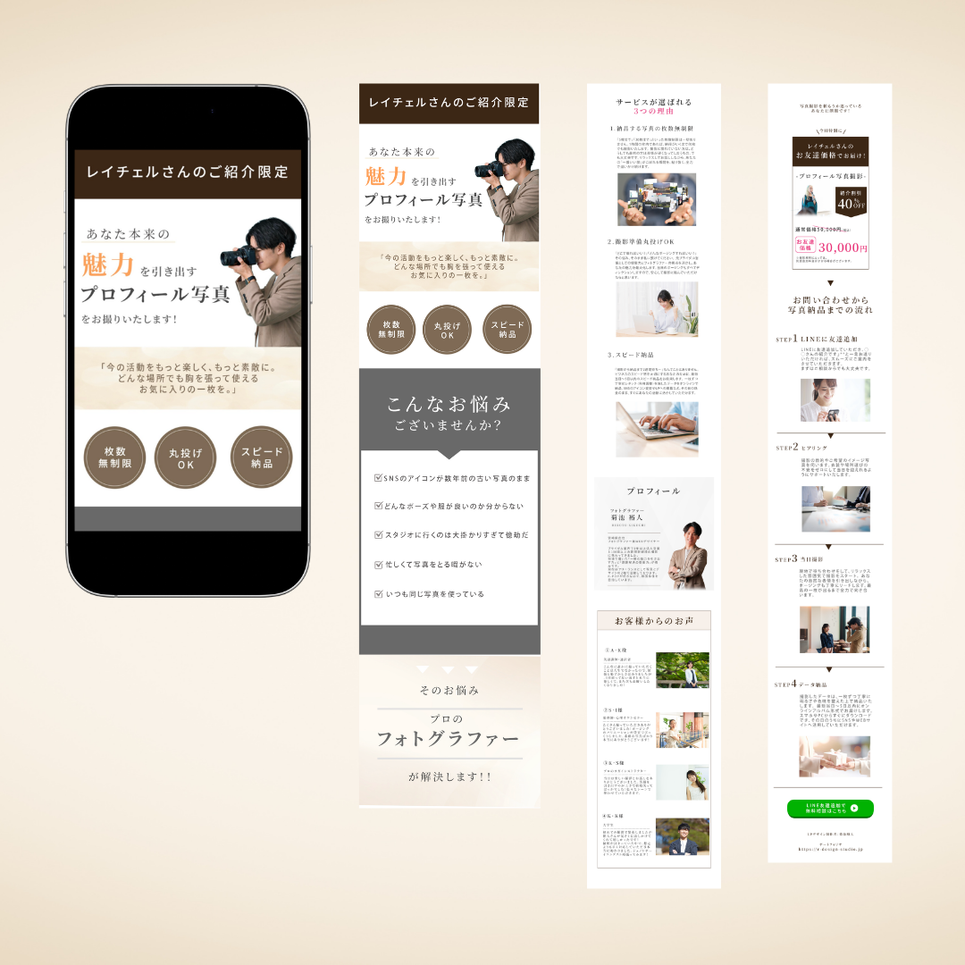 スマートフォン閲覧に最適化した縦長LPとして設計し、ユーザーの悩み喚起から撮影イメージの具体化、信頼性の訴求、LINE登録までを一貫した導線で構築しました。ファーストビューでは私からプロフィール写真を撮るメリット配置し、撮影の期待感を直感的に伝えています。続くセクションでは豊富な撮影実績を提示し、ビジネスシーンからプライベートまで幅広い用途に対応できることを訴求しました。